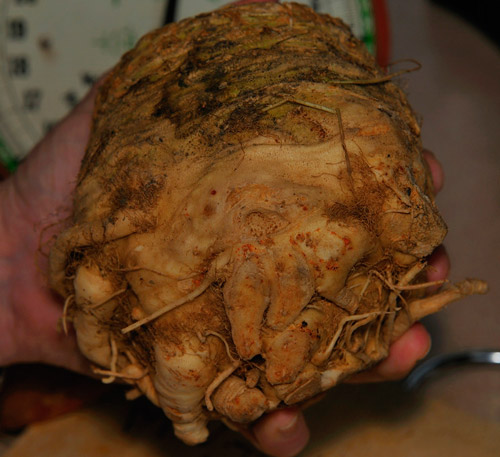 This soup also links to the last of the winter stores: the celeriac root is a tough root veggie that keeps well in a cool root cellar or modern refrigerator. I like to tie my seasons together—it makes me feel grounded in time and nature! Celeriac is a popular European vegetable, but you may have to search a bit here to find it. It must be peeled quite deeply, as the outer edges are very woody and nigh inedible. So, if the amount I start with seems heavy, a good deal of it is peeled away. Being potato-allergic inspired me to attack this formidable veggie and I was rewarded with succulent flavor!