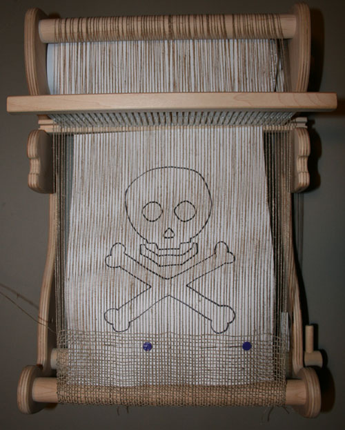 My home office is located in the central part of my house. This is great when everyone is away. I can juggle writing, checking email, cooking, laundry, and the ever important getting another cup of tea, all from my home base. The trouble comes when the people I live with are home. It’s hard for them to tell when I’m deep in the throes of the muse verses playing online Scrabble®. So I created this woven flag as a visual clue as to whether now would be a good time to approach me. It’s woven as a transparency, so it glows and looks especially menacing when my monitor is on. The knitting-needle hanger (optional) can be used to enforce the message, when necessary. Suggested Reading The Pirate Primer: Mastering the Language of Swashbucklers & Rogues Difficulty Boy Scout Dropout Finished Measurements 7.5”/19cm x 14”/35.5cm (excluding fringe and hanger) Download Arghh Skull Outline (pdf format) Materials