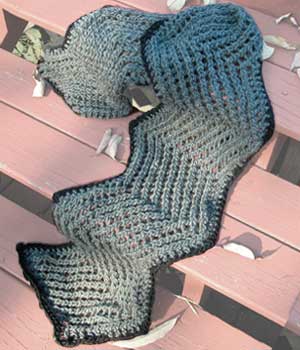 desired length has been reached. (Example knit to 70".) Finishing: Single crochet a border around the scarf in Color A, 1 crochet stitch to each knit stitch (horizontally) or row (vertically), except where the direction changes. In peaks, sc, dc, sc into apex stitch, in valleys skip over the nadir stitch. Weave in ends and block, paying special attention to pin peaks and nadirs into crisp points. About